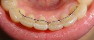 - Ретейнер. Представляет собой несъемную проволочную конструкцию, которая крепится к зубам с обратной стороны. Единственное неудобство при использовании — необходимость посещать стоматолога для профессиональной чистки моляров: под проволокой может образоваться кариес или зубной камень. Также ретейнеры невозможно самостоятельно снять или поставить обратно при отклеивании.